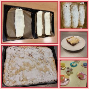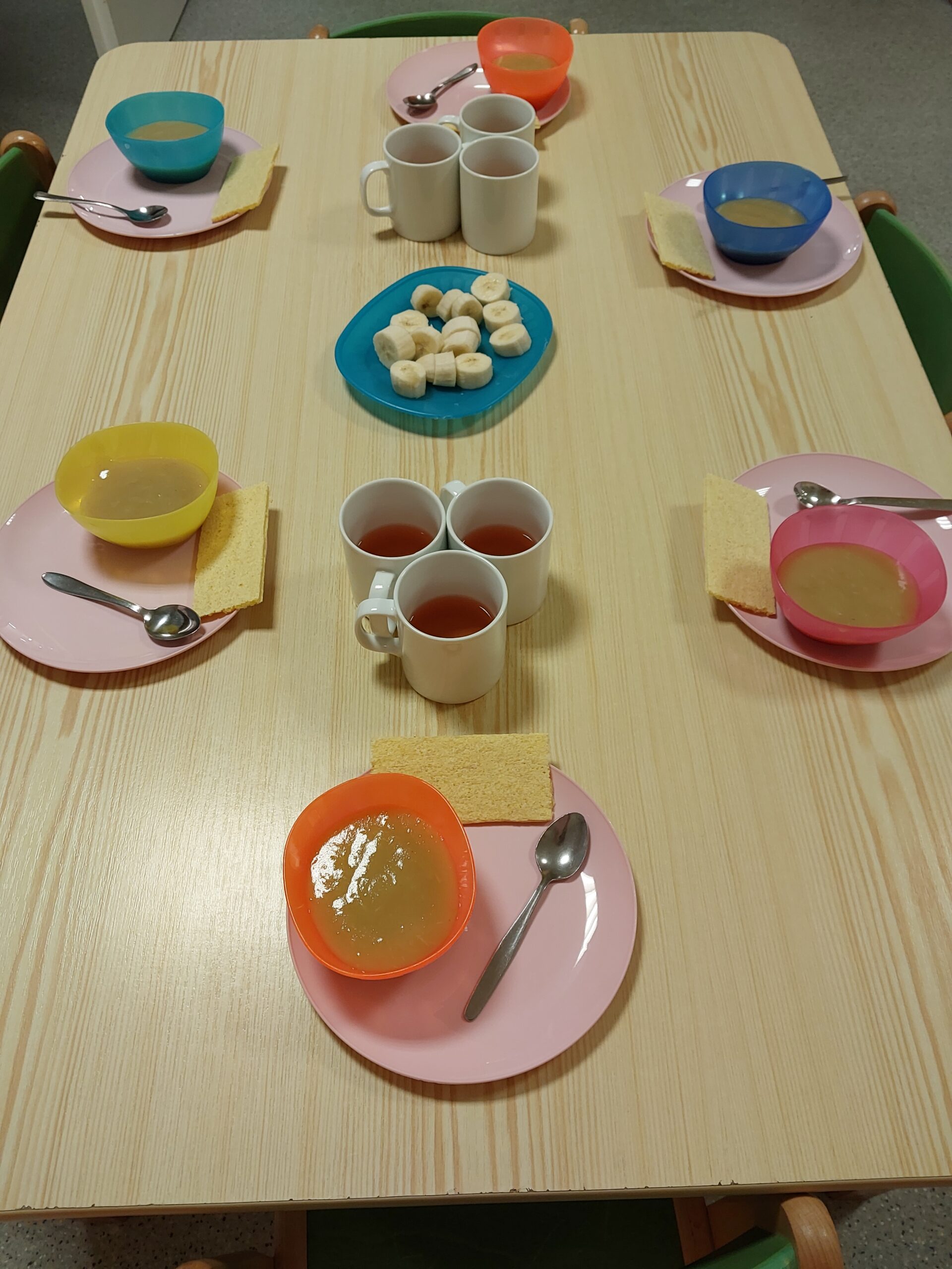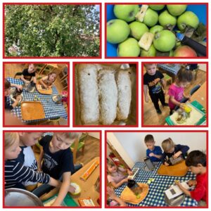 Zpracovaly jsme jablíčka z naší zahrádky, ze kterých si děti upekly štrůdl a paní kuchařky připravily domácí jablečnou přesnídávku a upekly buchtu s tvarohem a jablky. A celý týden si děti v rámci přesnídávky a svačiny pochutnávaly na jablíčkách z naší zahrádky.